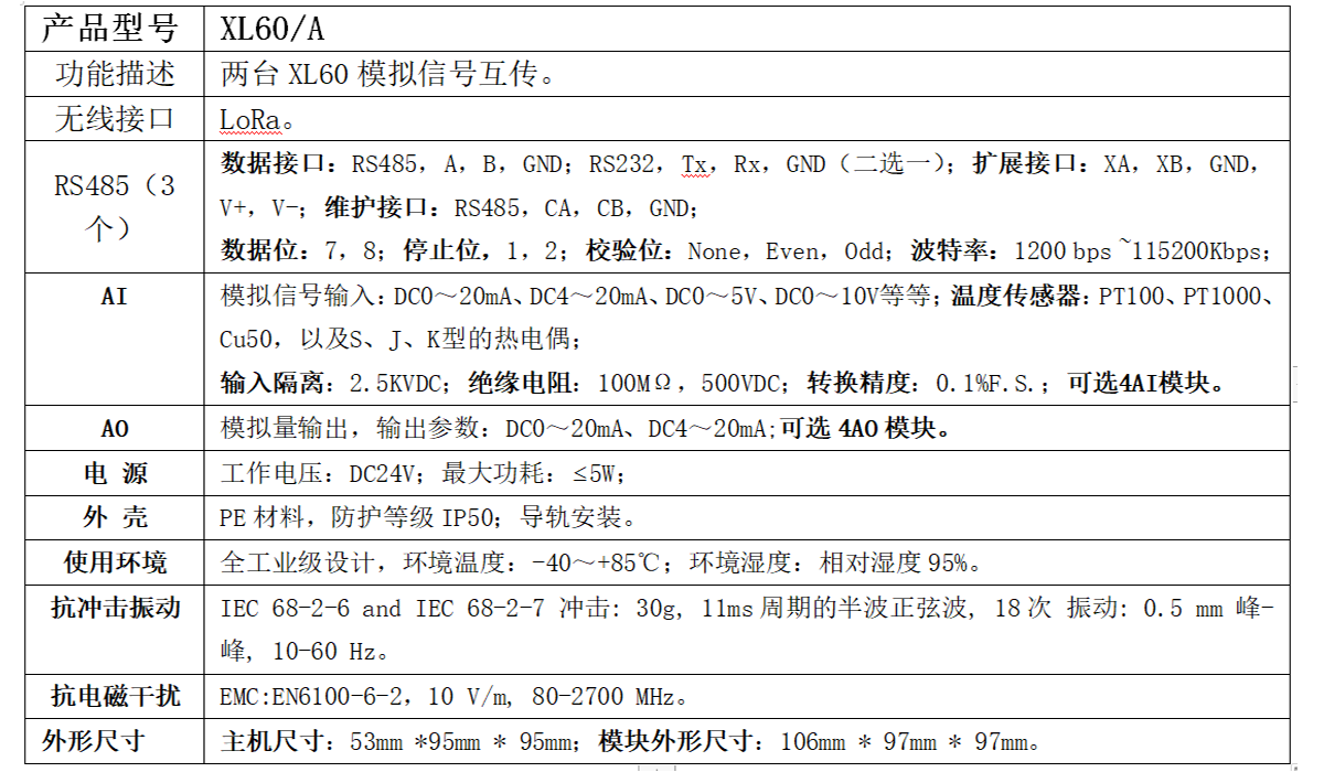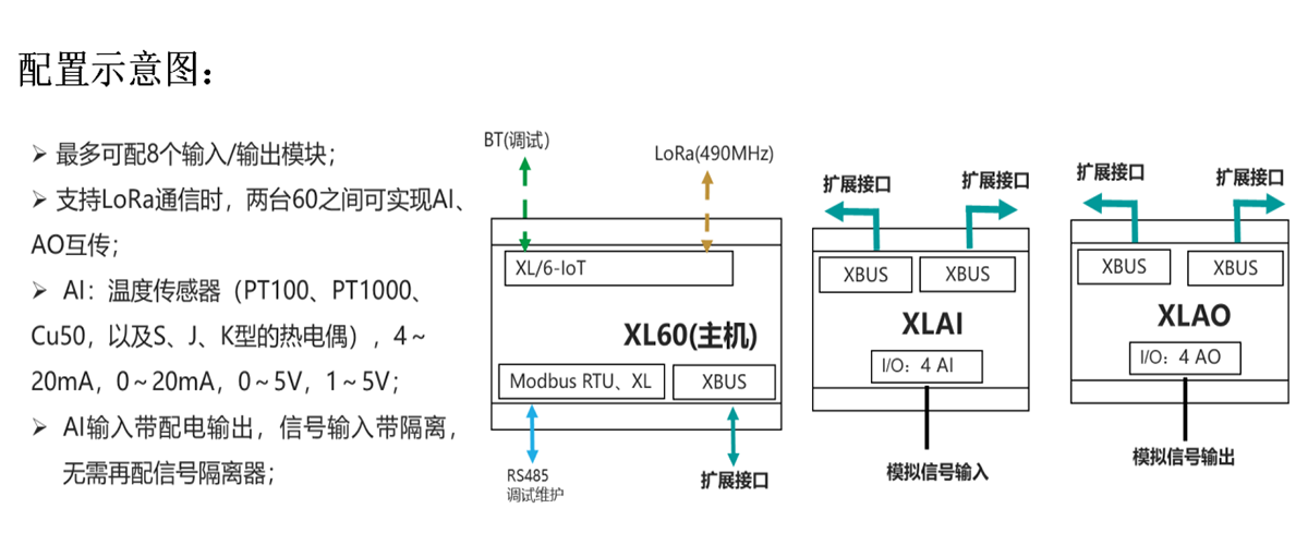 XL60A采用LoRa無線通信方式,每臺XL60A主機模塊,最多配兩個模擬量I/O模塊。