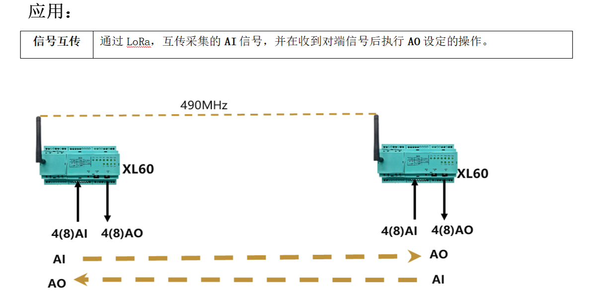 無線模擬量對傳模塊XL60A,由一對XL60A采集模塊組成,在一端的模塊輸入模擬信號,無線對傳到另一端輸出模擬信號,實現(xiàn)模擬信號一對一的輸入、輸出,AO隨著AI的變化而變化。