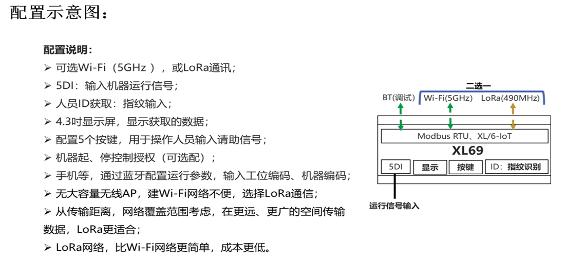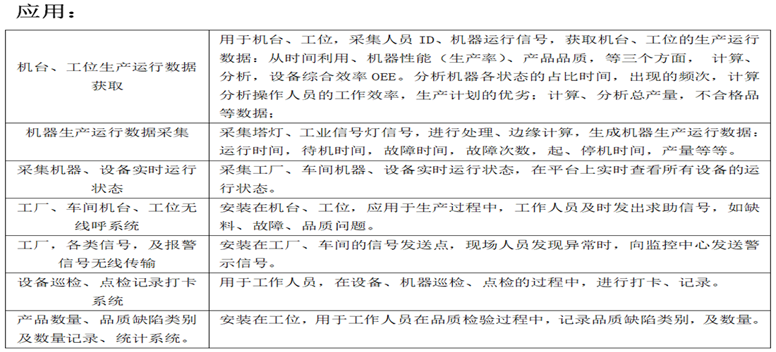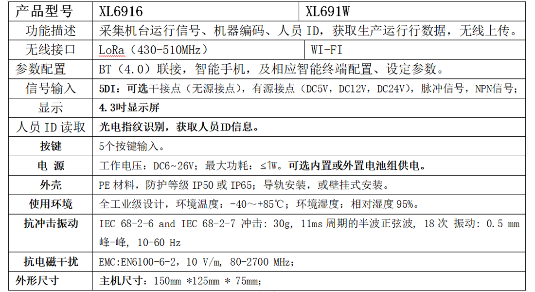 XL69機臺監(jiān)控裝置,采集機臺、工位人、機生產(chǎn)運行信號:機器運行狀態(tài)、人員ID信息及操作時間數(shù)據(jù),獲取機器、人員生產(chǎn)運行數(shù)據(jù),并對機臺的運行數(shù)據(jù)進行邊緣計算,統(tǒng)計、分析機臺的設(shè)備效率、時間效率、品質(zhì)效率,及綜合效率。通過無線方式,上傳獲取的數(shù)據(jù)。