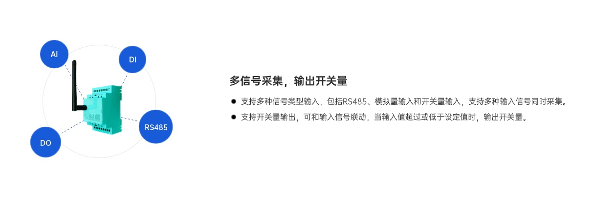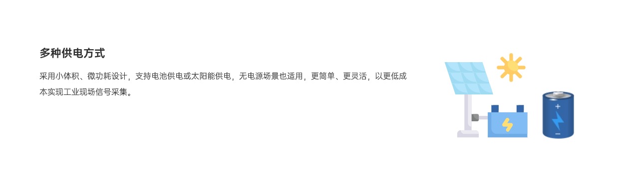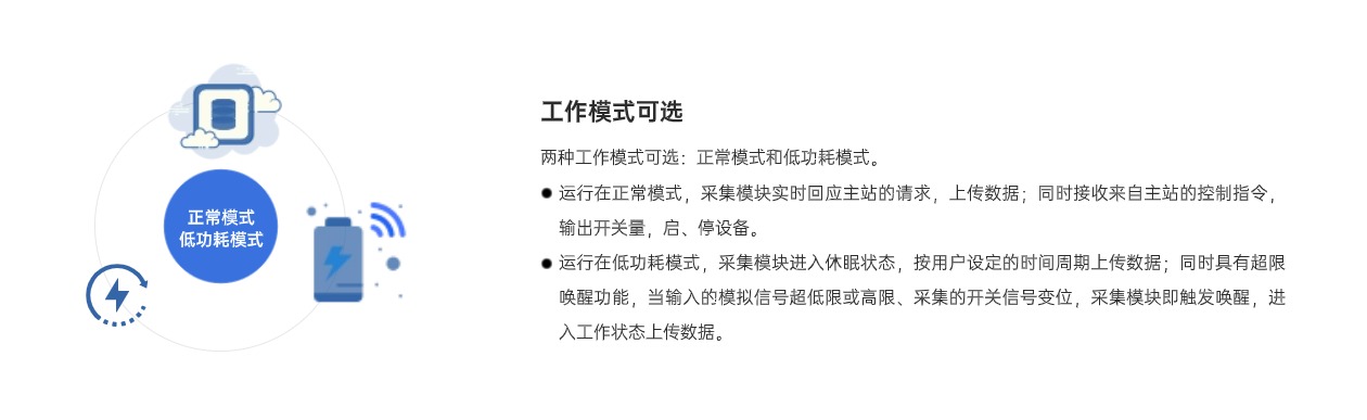 用于監(jiān)測點(diǎn)分散、數(shù)量少、供電不方便的場景。電池供電,變位、超限觸發(fā)功能,更適用于變送儀表信號(hào)、開關(guān)接點(diǎn)信號(hào)采集。