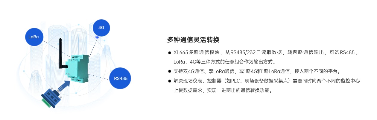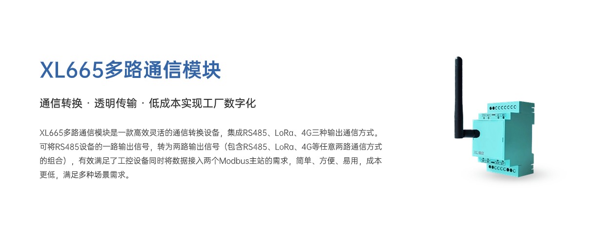 XL665多路通信模塊是一款高效靈活的通信轉(zhuǎn)換設(shè)備,集成RS4852、LoRa、4G三種輸出通信方式??蓪S485設(shè)備的一路輸出信號(hào),轉(zhuǎn)為兩路輸出信號(hào),(包含RS485、LoRa、4G等任意兩路通信方式的組合),有效滿(mǎn)足了工控設(shè)備同時(shí)將數(shù)據(jù)接入兩個(gè)Modbus主站的需求,簡(jiǎn)單、方便、易用,成本更低,滿(mǎn)足多種場(chǎng)景需求。