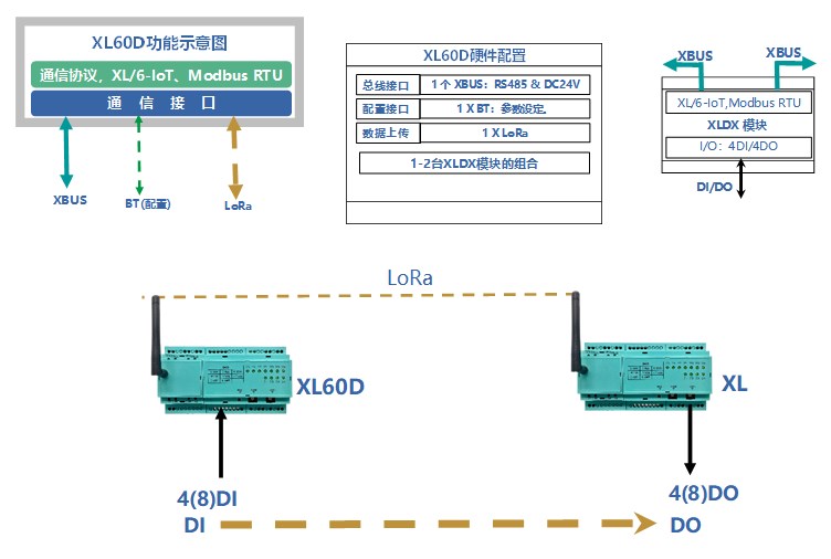 XL60D的通信方式是LoRa無(wú)線傳輸方式,每臺(tái)XL60D主機(jī)模塊,最多配兩個(gè)開(kāi)關(guān)量I/O模塊。
