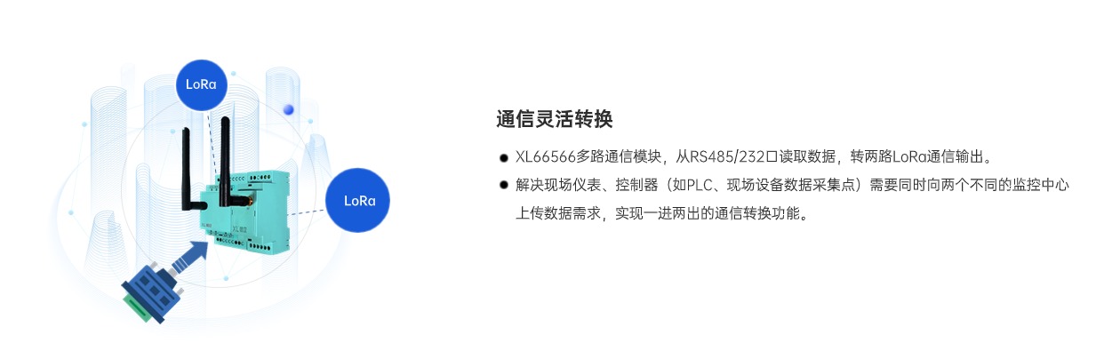 配置485/232口的二次儀表或控制系統(tǒng),轉(zhuǎn)2路LoRa信號輸出,接入兩個不同的主站。