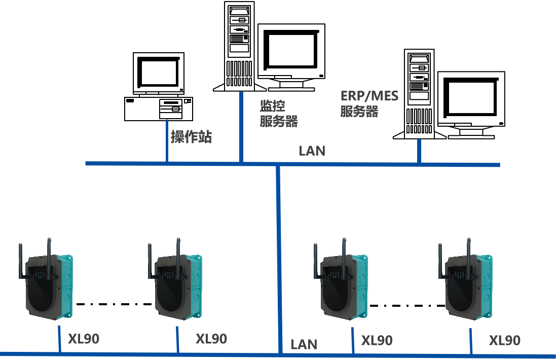 XL90物聯(lián)網(wǎng)關(guān),是系統(tǒng)的核心,從XL60上讀取數(shù)據(jù),進(jìn)行協(xié)議轉(zhuǎn)換、通訊處理,通過企業(yè)內(nèi)部LAN,推送數(shù)據(jù)至企業(yè)生產(chǎn)監(jiān)控平臺