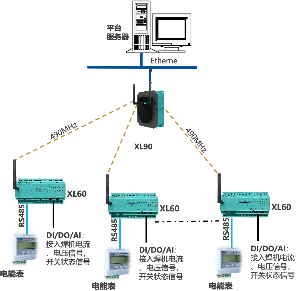 選擇XL60智能采集裝置,采集電焊機運行信號,及電能消耗數(shù)據(jù),上傳至XL90物聯(lián)網(wǎng)關(guān)