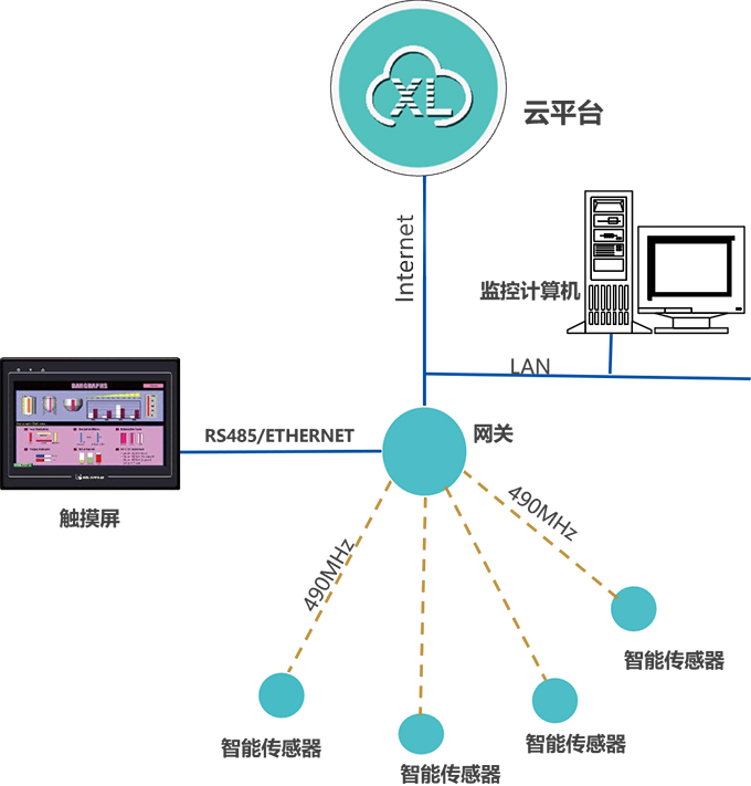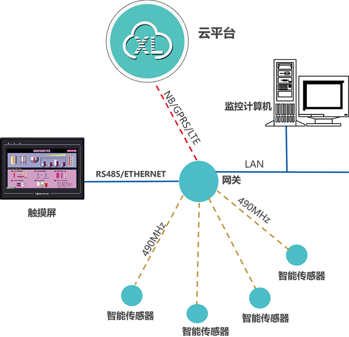 智能傳感器,通過LoRa(490MHz)上傳數(shù)據(jù)至物聯(lián)網(wǎng)關