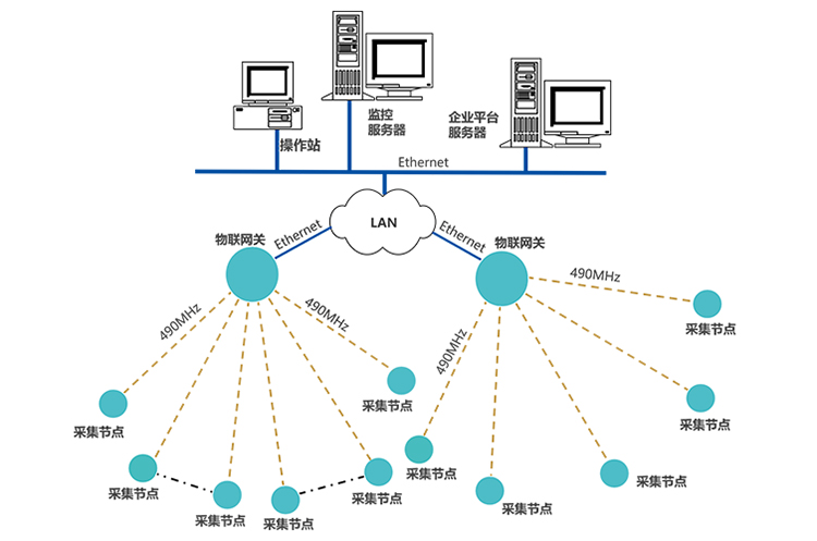 采集節(jié)點(diǎn)通過(guò)490MHz無(wú)線上傳數(shù)據(jù)至物聯(lián)網(wǎng)關(guān),網(wǎng)關(guān)通過(guò)Ethernet接入LAN,推送數(shù)據(jù)至企業(yè)管理平臺(tái)服務(wù)器;