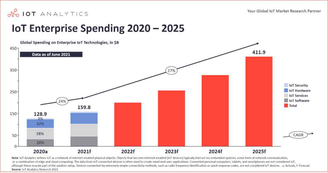 具體到物聯(lián)網(wǎng)行業(yè),2020年,全球物聯(lián)網(wǎng)的連接數(shù)首次超越了非物聯(lián)網(wǎng)連接數(shù),這標(biāo)志著物聯(lián)網(wǎng)發(fā)展達(dá)到了一個(gè)新的歷史時(shí)刻。而物聯(lián)網(wǎng)作為智能時(shí)代的新型基礎(chǔ)設(shè)施,其前進(jìn)的步伐必然不會(huì)停歇。據(jù)IoT Analytics公布的調(diào)研數(shù)據(jù)顯示,2020年最終企業(yè)用戶對(duì)物聯(lián)網(wǎng)解決方案的總支出達(dá)到1289億美元,預(yù)計(jì)到2021年底將達(dá)到1598億美元(約合1萬(wàn)億元人民幣)。