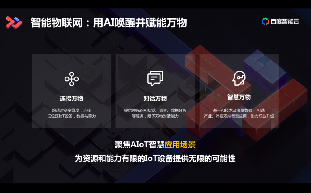 “智慧”是指百度智能云基于深厚的AI技術(shù)積累及海量數(shù)據(jù),打造產(chǎn)業(yè)、消費(fèi)雙端智慧應(yīng)用,將每一個(gè)物聯(lián)網(wǎng)終端升級(jí)為AIoT設(shè)備。