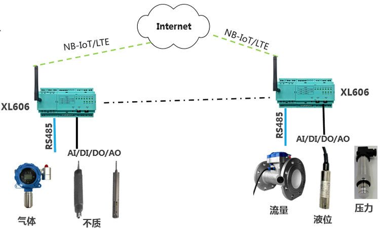 選擇XL60主機模塊,加I/O模塊,采集排放數(shù)據(jù),通過NB/4G上傳至監(jiān)控中心服務(wù)器,由于NB網(wǎng)絡(luò)覆蓋地域有限,建議選擇4G通信方式,資費差別不大;