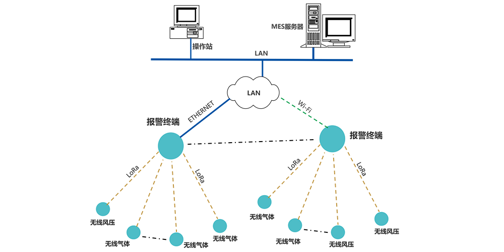 報警終端無線讀取監(jiān)測點上傳的數(shù)據(jù),進行處理、顯示、報警;并將數(shù)據(jù)通過局域網(wǎng),MQTT協(xié)議,上傳至MES。