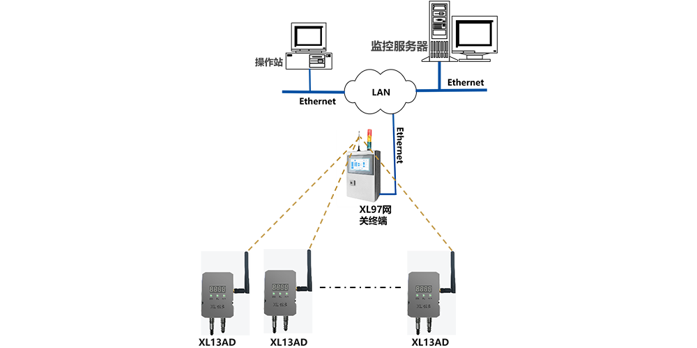 現(xiàn)場需要局部集中監(jiān)視時,可配置XL97網(wǎng)關(guān)終端,讀取區(qū)域內(nèi)XL13AD上傳的數(shù)據(jù),分析處理、顯示、報警,并轉(zhuǎn)發(fā)至監(jiān)控中心服務(wù)器。