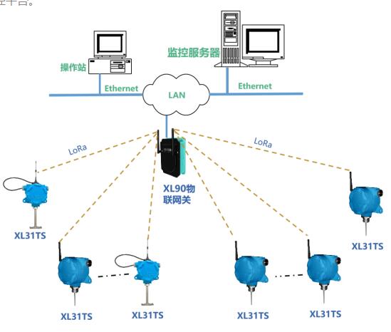 無線接收端選擇XL90物聯(lián)網(wǎng)關,物聯(lián)網(wǎng)關無線讀取溫度傳感器的數(shù)據(jù),進行處理、協(xié)議轉換,通過Ethernet上傳數(shù)據(jù)至監(jiān)控服務器,或接入DCS等其它監(jiān)控平臺。