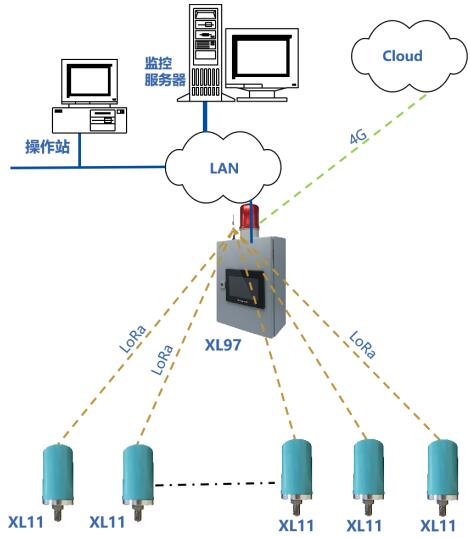 XL11系列傳感器采集設備運行過程電動機、減速機等零部件的溫度、振動數(shù)據(jù),并通過 LoRa 或 LoRaWAN 無線通信方式,接入XL97物聯(lián)網(wǎng)關(guān)終端,網(wǎng)關(guān)通過Ethernet、Wi-Fi、4G接口連接SCADS、DCS或云端監(jiān)控平臺,支持MQTT、API、SOAP(WEB Service )、Modbus RTU/TCP協(xié)議。