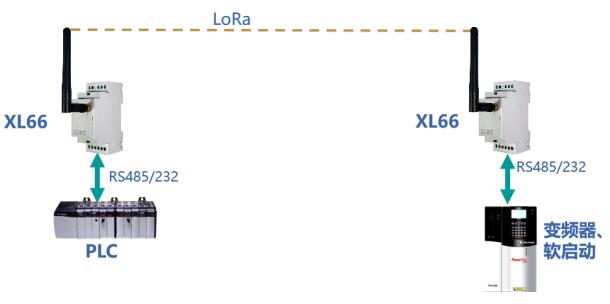 對于任意2臺帶RS485、232通信接口的設備,可分別與一臺XL66通過其RS485、232通信接口連接,其數(shù)據(jù)通過這2兩臺XL66,以無線通信方式實現(xiàn)數(shù)據(jù)透傳,從而免去現(xiàn)場繁雜的施工布線。