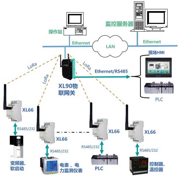 帶RS485或232通信接口的控制器、二次儀表、變送器等設備,通過通信接口與XL66連接,XL66通過LoRa無線通信方式將數(shù)據(jù)上傳至XL90或XL95物聯(lián)網(wǎng)關,網(wǎng)關通過以太網(wǎng)或RS485,上傳數(shù)據(jù)至監(jiān)控平臺、PLC、觸摸屏、控制器等設備。從而實現(xiàn)有線串口設備的無線聯(lián)網(wǎng)。
