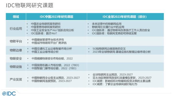 2023年IDC持續(xù)跟進(jìn)物聯(lián)網(wǎng)的研究,圍繞重點(diǎn)行業(yè)應(yīng)用、物聯(lián)平臺(tái)、物聯(lián)邊緣、物聯(lián)安全及物聯(lián)感知新設(shè)備技術(shù)開展,具體研究課題如下: