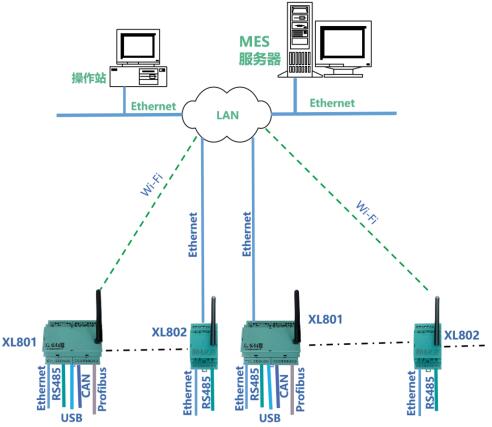 XL80通信主機(jī),從設(shè)備通信接口,讀取設(shè)備或系統(tǒng)的運(yùn)行數(shù)據(jù),通信協(xié)議轉(zhuǎn)換處理后,再通過Ethernet或Wi-Fi,接入LAN,轉(zhuǎn)發(fā)數(shù)據(jù)至MES。