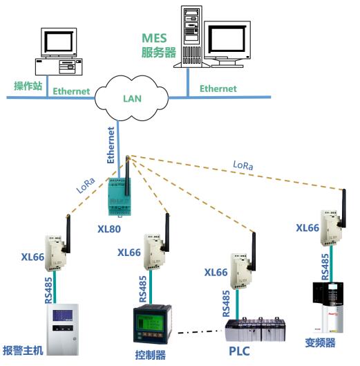 XL80主機(jī),通過LoRa無線接口,從XL66無線讀取設(shè)備的運(yùn)行數(shù)據(jù),通信協(xié)議轉(zhuǎn)換處理后,通過Ethernet,轉(zhuǎn)發(fā)數(shù)據(jù)至MES。