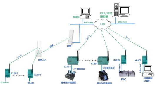對于安裝分散,離LAN接口遠(yuǎn)的設(shè)備,設(shè)計(jì)XL80安裝在LAN口附近接入局域網(wǎng),選擇XL66無線轉(zhuǎn)換器,連接設(shè)備RS485/RS232接口,實(shí)現(xiàn)設(shè)備無線聯(lián)接XL80通信主機(jī)。