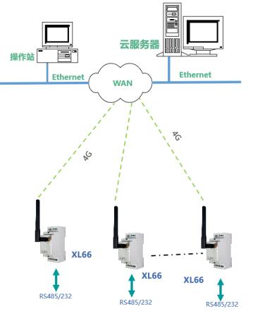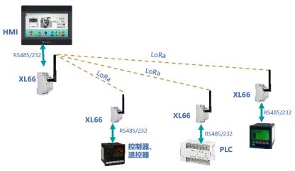 一臺XL66與多臺XL66連接,實(shí)現(xiàn)一對多,RS485/232設(shè)備間無線通信。