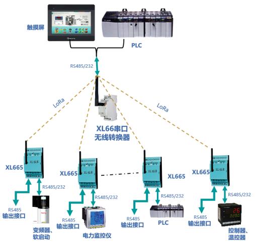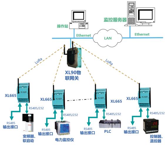 通過LoRa無線傳輸模塊輸出的數(shù)據(jù),可上傳至XL90物聯(lián)網(wǎng)關(guān)接入監(jiān)控軟件平臺,或通過XL66串口無線轉(zhuǎn)換器,與PLC、觸摸屏等通信。