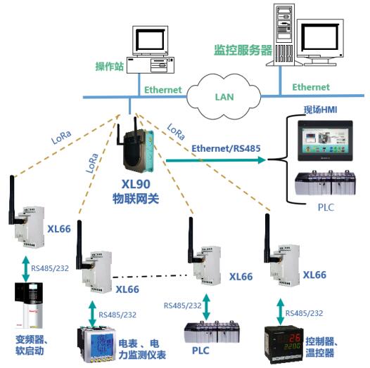 選擇 XL66 串口無線轉(zhuǎn)換器 ,接入控制儀表、變頻器等設(shè)備的 RS485/232 接口,讀取所需數(shù)據(jù),無線傳輸至網(wǎng)關(guān)節(jié)點。選擇 XL90 物聯(lián)網(wǎng)關(guān) ,作為無線接收端,轉(zhuǎn)發(fā)數(shù)據(jù)。