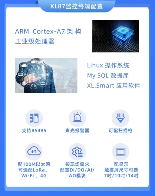 XL87監(jiān)控終端,以一套生產(chǎn)設(shè)備、一條產(chǎn)線、或是多臺(tái)相關(guān)聯(lián)的機(jī)器設(shè)備作為一個(gè)監(jiān)測(cè)對(duì)象,可實(shí)現(xiàn)設(shè)備數(shù)據(jù)采集、運(yùn)行狀態(tài)監(jiān)測(cè)、物料追溯、設(shè)備信息讀取、機(jī)器啟??刂频裙δ?。