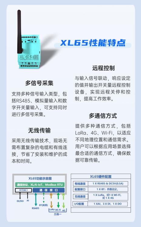 設(shè)備選型:選擇XL65無線采集器,配置DI、AI、RS485等輸入,從機器設(shè)備上采集狀態(tài)信號,從而獲取基礎(chǔ)數(shù)據(jù);并配DO輸出,可下發(fā)控制、通知、呼喚等信號。
