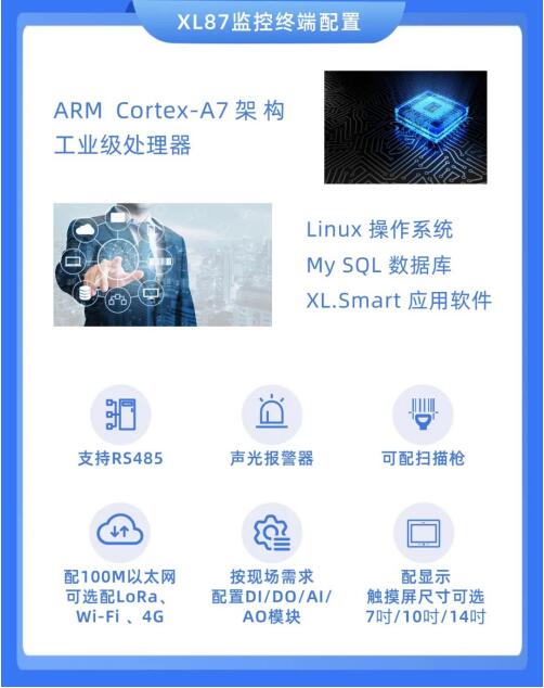 設(shè)備選型:選擇XL87監(jiān)控終端,搭配相應(yīng)技術(shù)參數(shù)的傳感器、流量計、水表計量裝置等,可實現(xiàn)對上述生產(chǎn)數(shù)據(jù)的采集,進(jìn)而分析、判斷、追溯產(chǎn)品質(zhì)量,判斷設(shè)備效率、運行經(jīng)濟性等指標(biāo)。