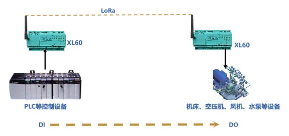 一對(duì) XL60 無(wú)線采集裝置 ,一臺(tái)與 PLC 等控制儀表連接,作信號(hào)發(fā)射端;一臺(tái)配置在生產(chǎn)現(xiàn)場(chǎng),作信號(hào)接收端。發(fā)射端的 XL60 將控制儀表的啟停命令,通過(guò) LoRa 無(wú)線對(duì)傳到接收端,接收端的 XL60 輸出開(kāi)關(guān)量信號(hào),控制設(shè)備啟、停。