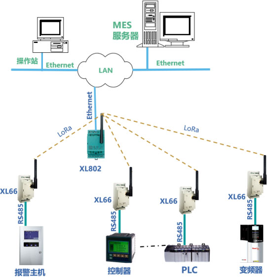 XL66無線轉(zhuǎn)換器通過RS485/RS232接口讀取設備數(shù)據(jù),設計XL802通信主機安裝在LAN口附近接入局域網(wǎng),并通過LoRa無線接口,從XL66無線讀取設備的運行數(shù)據(jù),通信協(xié)議轉(zhuǎn)換處理后,通過Ethernet,轉(zhuǎn)發(fā)數(shù)據(jù)至MES。