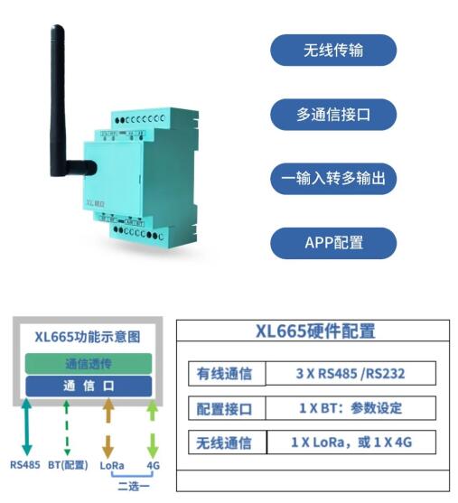 一路RS485信號(hào),經(jīng)由XL665無(wú)線轉(zhuǎn)換器,輸出一路RS485信號(hào)和一路LoRa無(wú)線信號(hào),同時(shí)接入兩個(gè)不同的設(shè)備(系統(tǒng))。