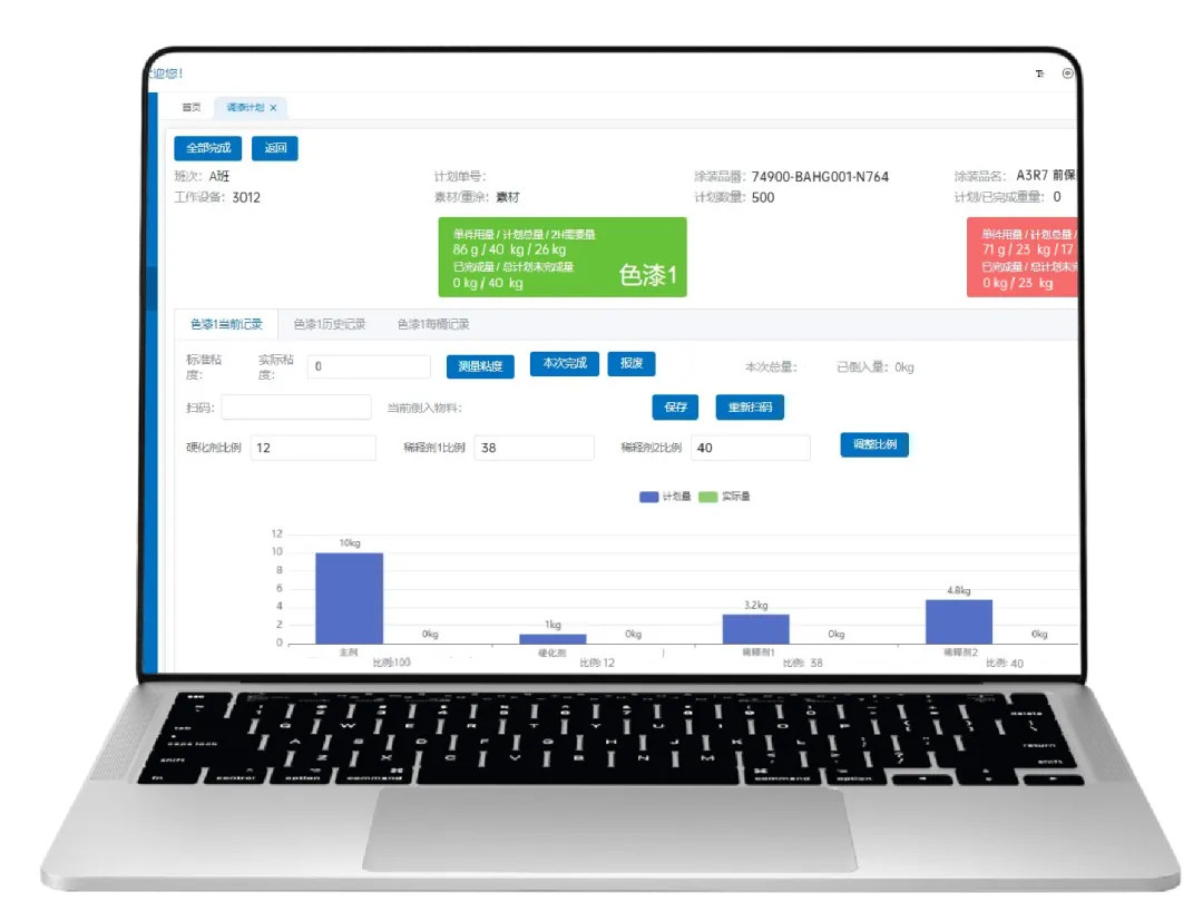 系統指導操作員按照標準工藝流程進行調和,實時監(jiān)控調漆過程以防止錯誤操作。
