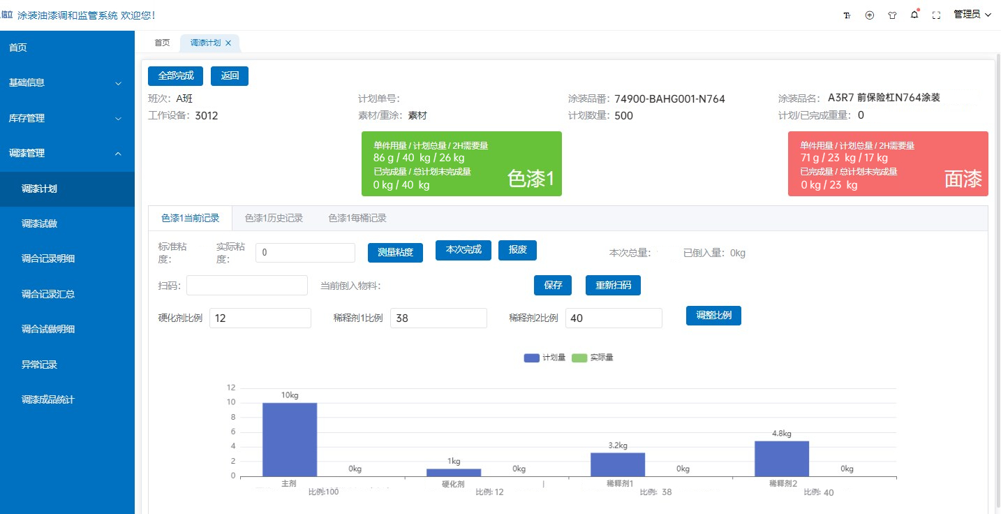 系統(tǒng)采用可視化直觀調(diào)漆界面設(shè)計(jì),根據(jù)調(diào)漆計(jì)劃智能匹配調(diào)漆工藝,自動計(jì)算主劑、固化劑、稀釋劑需要的重量,以色塊的形式實(shí)時顯示已倒入的原料重量。