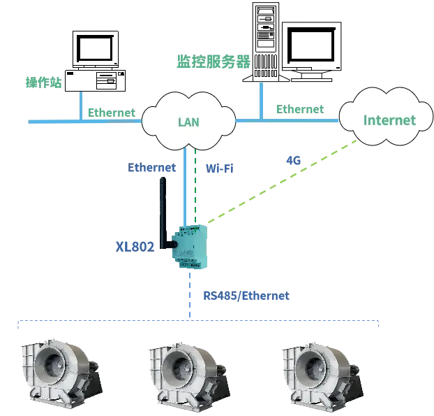 選擇XL802通信主機(jī),接入離心風(fēng)機(jī)的PLC,實時采集設(shè)備風(fēng)量、風(fēng)壓、轉(zhuǎn)速、功率等運行參數(shù)。