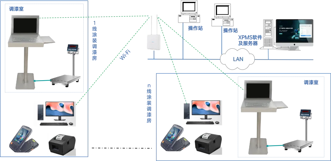 信立智能調(diào)漆系統(tǒng)由服務(wù)器及平臺(tái)軟件、調(diào)漆終端、出入庫(kù)終端、Wi-Fi網(wǎng)絡(luò)構(gòu)成。