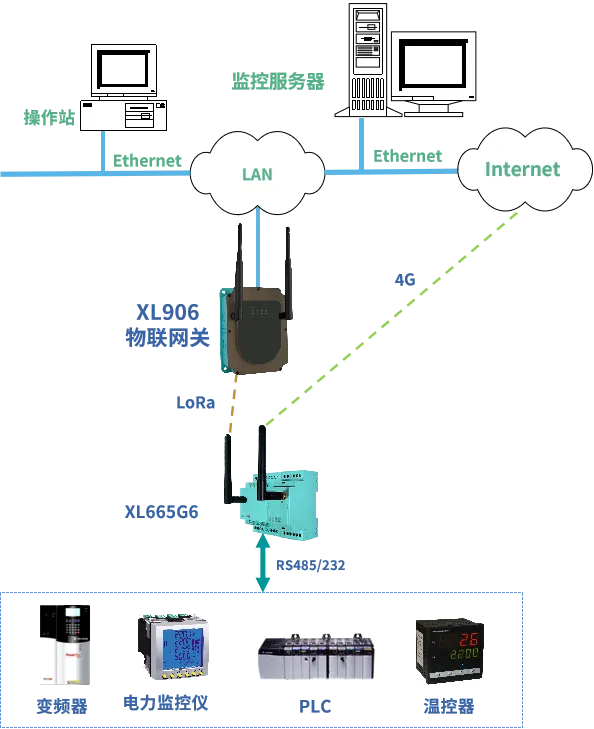 只配置有一個RS485通信口的設(shè)備,輸出的RS485信號接入XL665多路通信模塊,轉(zhuǎn)一路LoRa信號和一路4G信號輸出,同時接入現(xiàn)場控制中心和云平臺,實(shí)現(xiàn)設(shè)備數(shù)據(jù)同時接入兩個不同的管理平臺。