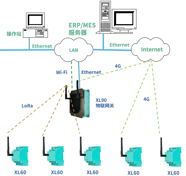 接入企業(yè)監(jiān)控平臺:XL60無線采集模塊采用LoRa無線傳輸數(shù)據(jù)至XL90網(wǎng)關(guān),網(wǎng)關(guān)通過Ethernet/WiFi等方式接入監(jiān)控平臺;