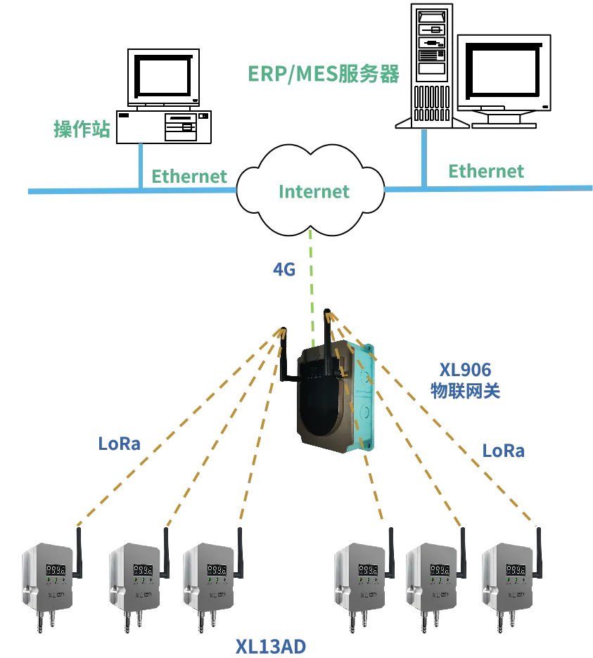 為規(guī)避布線破壞潔凈室氣密性,方案采用無(wú)線組網(wǎng)方式,XL13AD無(wú)線壓差傳感器通過(guò)LoRa無(wú)線傳輸壓差數(shù)據(jù)至XL90物聯(lián)網(wǎng)關(guān),物聯(lián)網(wǎng)關(guān)通過(guò)4G傳輸數(shù)據(jù)至云平臺(tái)。