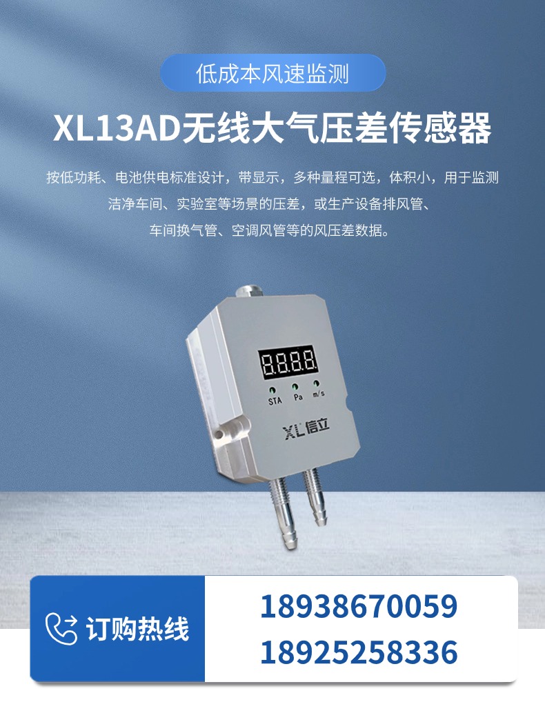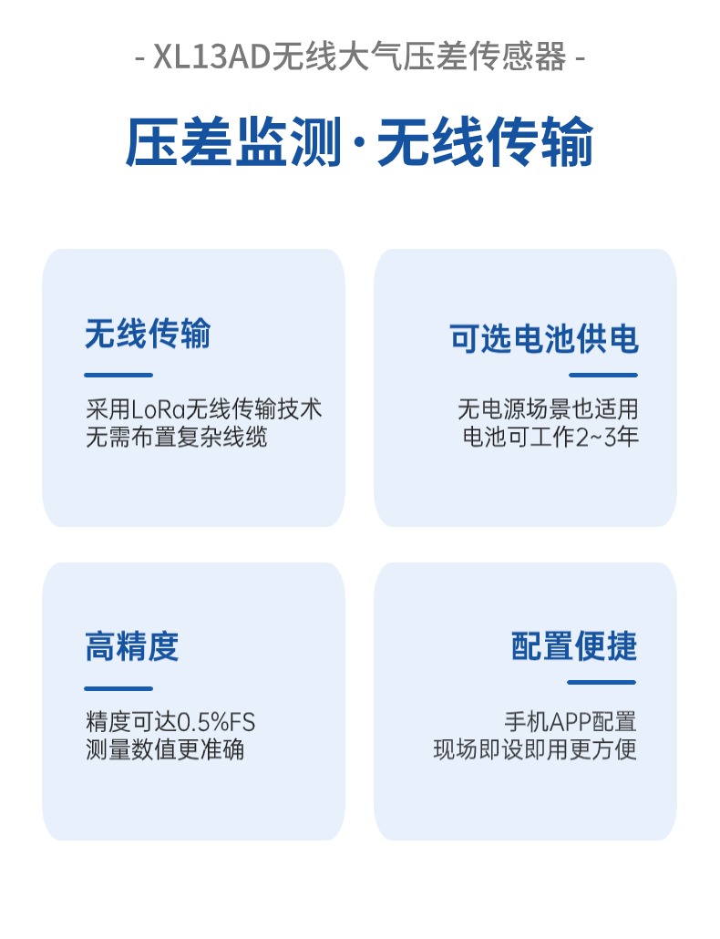 選用XL13AD無(wú)線壓差傳感器,部署于潔凈區(qū)邊界、動(dòng)態(tài)風(fēng)險(xiǎn)點(diǎn)等關(guān)鍵點(diǎn),實(shí)時(shí)監(jiān)測(cè)壓差,并聯(lián)動(dòng)回風(fēng)管或排風(fēng)管上的電動(dòng)調(diào)節(jié)閥,當(dāng)壓差異常時(shí)自動(dòng)調(diào)節(jié)送/排風(fēng)量。
