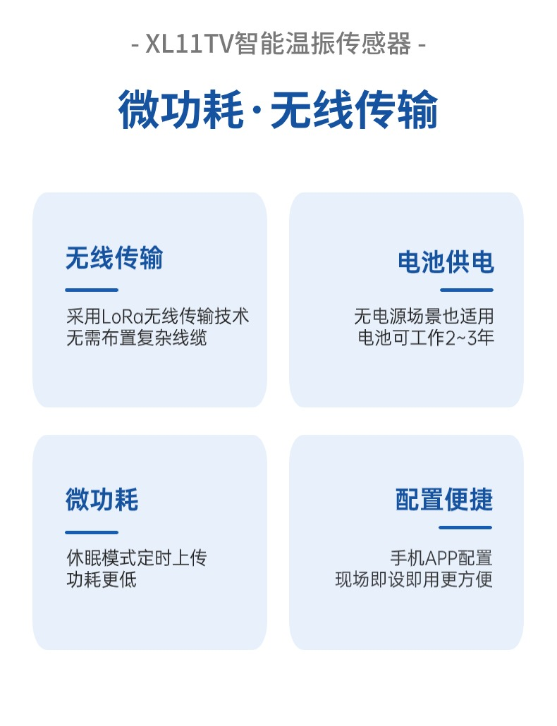 XL11TV溫振傳感器通過振動 + 溫度雙參數(shù)監(jiān)測,可實時捕捉設(shè)備異常信號,結(jié)合監(jiān)控平臺智能算法實現(xiàn)智能故障預(yù)警,為企業(yè)構(gòu)建 “預(yù)防為主” 的設(shè)備管理體系提供技術(shù)支撐。